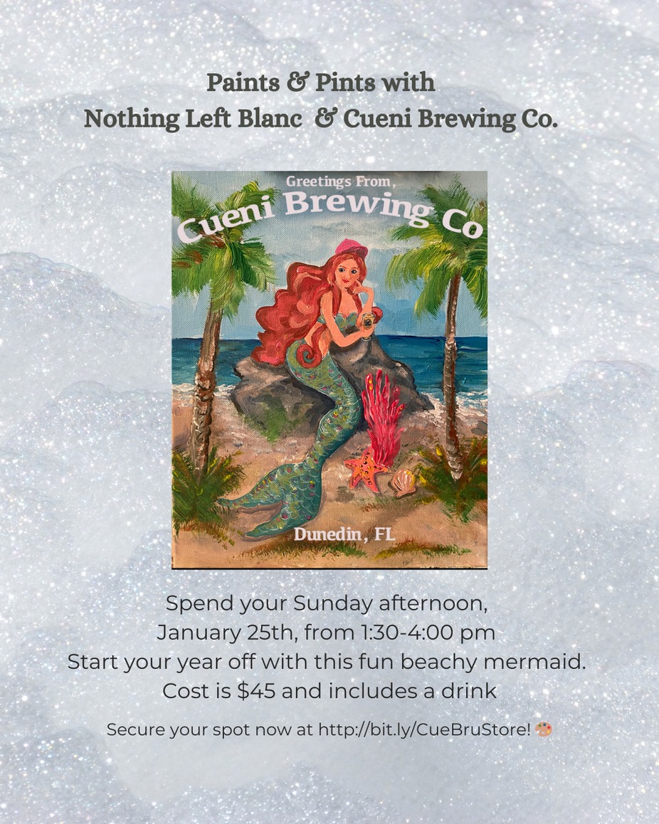 Join Robin of Nothing Left Blanc for her next Paint & Pints Night. Our January class will feature a Mermaid welcoming you to Dunedin. The class is only $45 and includes a painting session, expert guidance, and a complimentary beverage. Tickets are limited, so sign up today. You can order online at